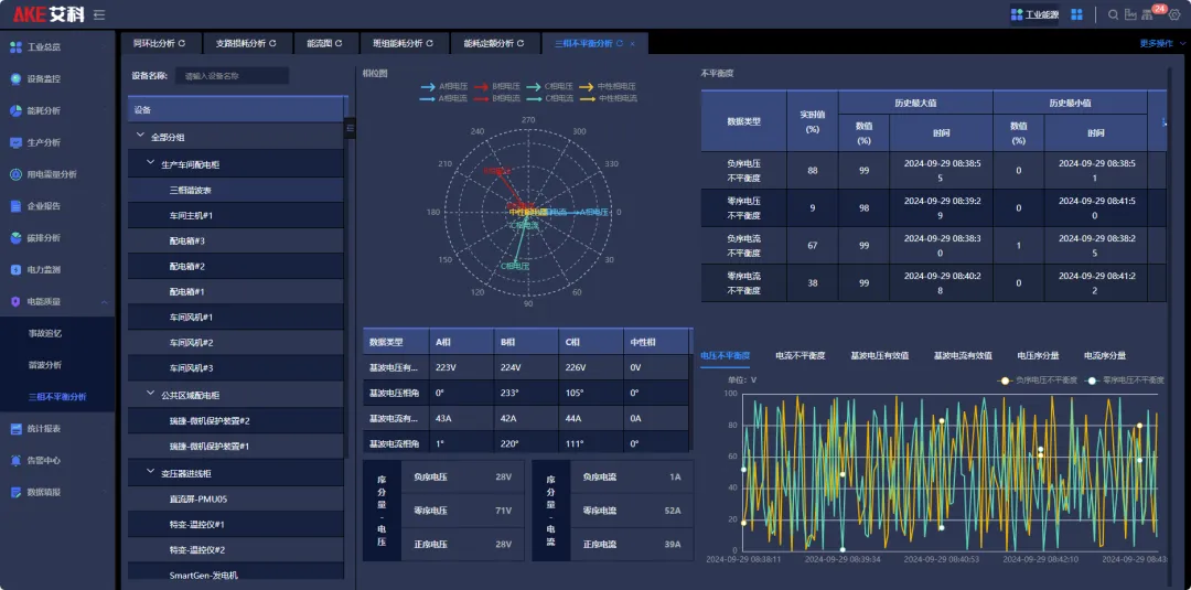 對諧波、不平衡度等專業電能質量參數進行持續監測,實現對配電設備實時監測和故障診斷,提升運維效率,為企業生產用電保駕護航。