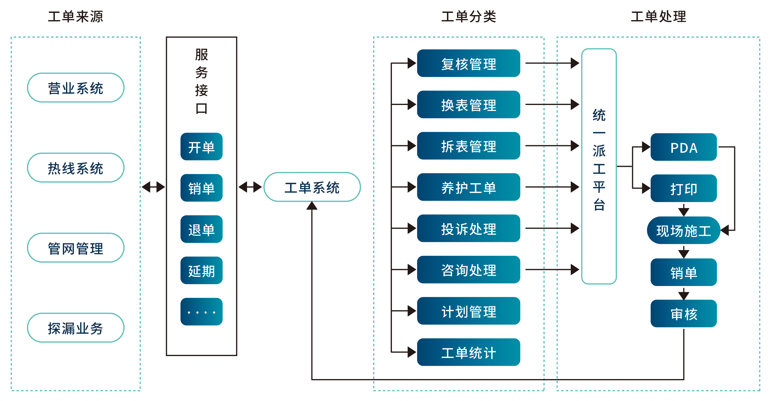 外業工單管理系統作為一套整合工作平臺,提供對涉及工單的業務流程的接入、展示和管理。將水務系統中各類工單按照預先設置的流程進行流轉,管理員可以看到整個工單的節點時間、內容、經辦人、流程等信息,提高管理透明度,該流程亦可成為解決爭端的證據或人員考核指標。當前流程人員也可根據流程安排進行工作,減少人為判斷的情況,將工單處理流程信息化 、標準化。