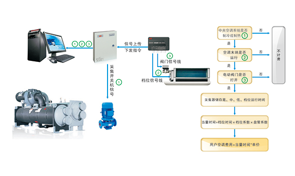 時間法集中空調分戶計量系統是通過采集空調主機的工作狀態、末端設備的運行狀態和運行時間等信息,將其轉換成當量時間,作為集中空調費用分攤依據的計量管理系統。