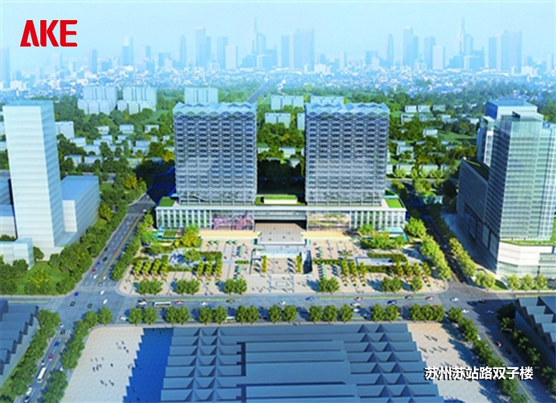 蘇州蘇站路雙子樓項目建筑主體為兩個塔樓,東西并行分列,建筑面積:14萬 平方米地上20層,局部21層,地下2層,其中第三、四兩層空中連廊相接。