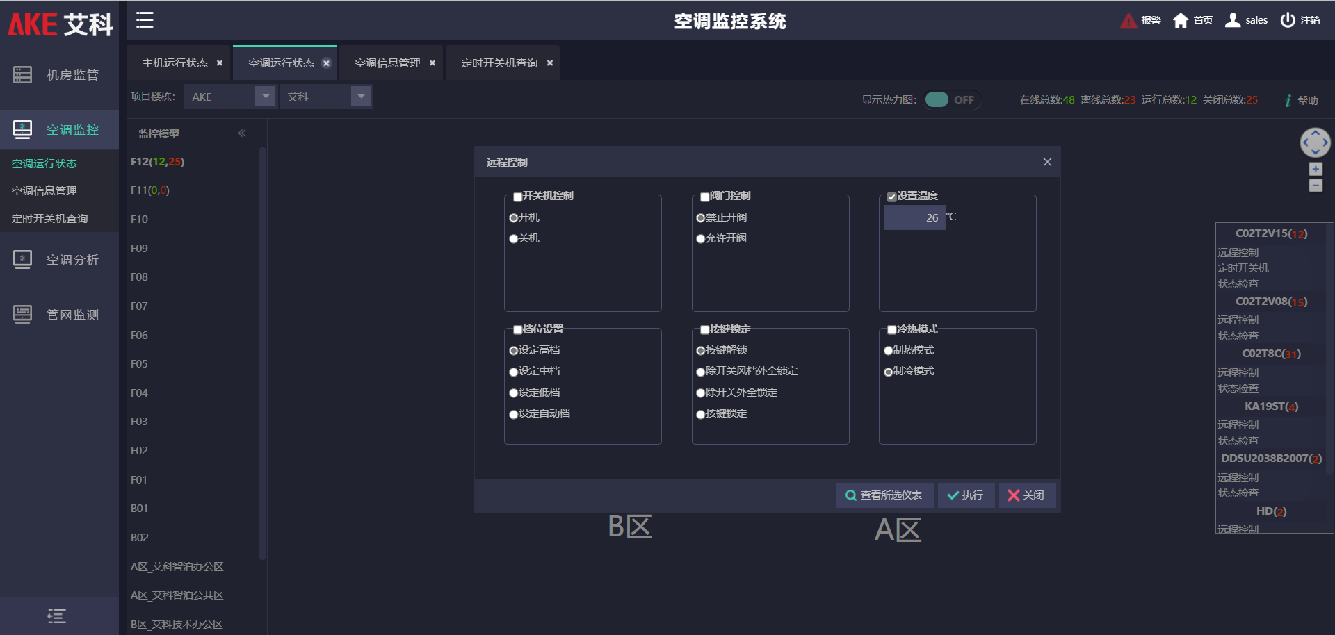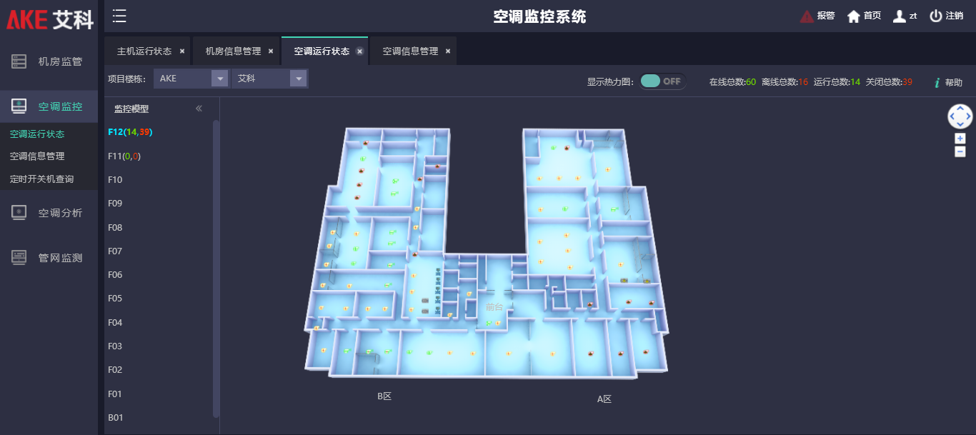 艾科智慧建筑能源管理平臺,掌握設備實時連接狀態與通訊情況,監測系統末端設備運行情況,可視化設備分布情況,實現末端設備遠程統一管理。