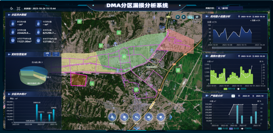 02、DMA分區(qū)漏損分析:展示預(yù)設(shè)的DMA分區(qū)基礎(chǔ)數(shù)據(jù),結(jié)合營收系統(tǒng)的產(chǎn)銷數(shù)據(jù),并通過特定的漏損算法分析,直觀展示DMA分區(qū)漏損情況,為水司工作人員提供數(shù)據(jù)分析支撐,優(yōu)化產(chǎn)銷差率。